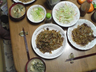 今日は焼きそばを頂きます。シメジ、キャベツ、モヤシ、豚肉などを用意・・・フライパンにオリーブ油を入れ、豚肉から炒めます。キャベツ、シメジも入れます。モヤシを入れます。麺は電子レンジで1分ほど温めてから入れます。 麺とソースを入れ、混ぜ合わせます。完成。半熟卵をトッピング・・・味噌汁は豆苗と揚げ豆腐・・・キャベツサラダも頂きます。今日もおいしく頂きました。