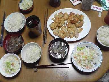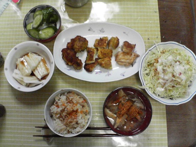 今日は鶏肉などを頂きます。鶏肉・・・市販の味付け鶏、香味、カレー、塩、の3種類?炊き込み御飯も頂きます。山芋も頂きます。味噌汁は大根とあぶらげ・・・胡瓜とキャベツサラダも頂きます。今日もおいしく頂きました。