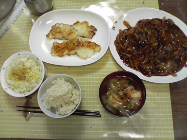 今日は鱈などを頂きます。フライパンにオリーブ油を入れ、鱈を焼きます。市販の香味焼きの素を使います。完成。玉葱のあんかけ炒めも頂きます。酢豚の風味?味噌汁はシメジとあぶらげ・・・キャベツサラダも頂きます。今日もおいしく頂きました。