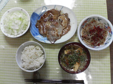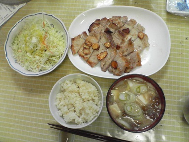 今日は豚肉などを頂きます。フライパンにオリーブ油を入れ、豚肉を焼きます。完成。軽く焼いたスライスにんにくをトッピング・・・味噌汁は豆腐とナメコ・・・キャベツサラダも頂きます。今日もおいしく頂きました。