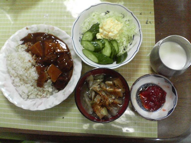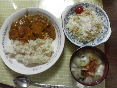 今日はカレーを頂きます。カレー粉などをトッピングして強化?味噌汁は豆腐とネギ・・・キャベツサラダも頂きます。今日もおいしく頂きました。