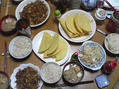 今日はタコス風?のものを頂きます。挽肉、玉葱、ジャガイモ、舞茸、シメジなどを用意、微塵切りにします。フライパンにオリーブ油を入れ、挽肉から炒めます。スライスにんにくも加えます。野菜類を加えます。タコシーズニングを加えて混ぜ合わせます。完成。電子レンジで加熱したシェルを用意・・・シェルに具を入れてキャベツを乗せ、チリソースを少々かけて頂きます。都合により、モヤシの味噌汁と御飯もあります。トッピング用キャベツ・・今日もおいしく頂きました。
