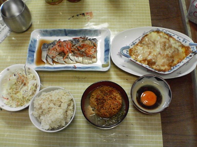 今日はホッケなどを頂きます。小ぶりのホッケ・・・ポテトのチーズ焼き・・・スナック菓子も流用?肉団子も頂きます。味噌汁はモヤシ・・・キャベツサラダも頂きます。今日もおいしく頂きました。