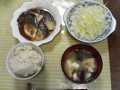今日は鯖の味噌煮を頂きます。市販の鯖の味噌煮・・・骨抜きしてあるので便利です。味噌汁は豆腐とワカメ・・・キャベツサラダも頂きます。今日もおいしく頂きました。