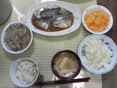 今日は鯖などを頂きます。出来合いの鯖の味噌煮・・・モヤシ炒めも頂きます。味噌汁はモヤシとあぶらげ・・・キャベツサラダも頂きます。デザート付・・・伊予柑?今日もおいしく頂きました。