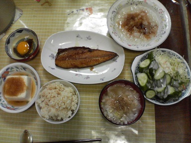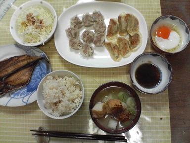 今日は焼売などを頂きます。餃子と焼売を頂きます。鯵が余っていたので頂きます。味噌汁は揚げ豆腐と葱・・・温泉玉子も頂きます。キャベツサラダ・・・今日もおいしく頂きました。