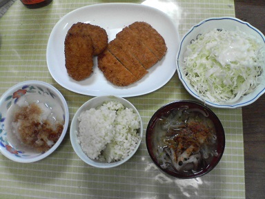 今日は揚物を頂きます。コロッケとメンチカツ・・・大根おろしも頂きます。味噌汁はモヤシとシメジ・・・キャベツサラダも頂きます。今日もおいしく頂きました。