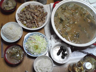 今日は鍋物と鶏肉を頂きます。野菜鍋風?ありあわせの材料で作ります。味付けは味噌と胡麻油を使います。次は鶏肉を焼きます。鶏皮と胸肉をオリーブ油で炒めます。完成。鍋物というよりは味噌汁?キャベツサラダも頂きます。今日もおいしく頂きました。