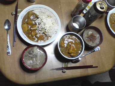 今日はカレーを頂きます。各自、トッピングを工夫・・・これはチーズを乗せています。丼カレー?カレー丼?味噌汁は大根とあぶらげ・・・今日もおいしく頂きました。