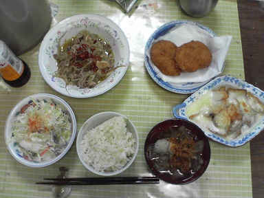 今日はモヤシ炒めなどを頂きます。モヤシと豚肉を市販の素で炒めます。チーズポテト?フライドポテトにチーズを乗せて電子レンジで加熱・・・コロッケも頂きます。味噌汁は大根と舞茸・・・サラダも頂きます。今日もおいしく頂きました。