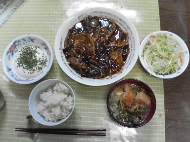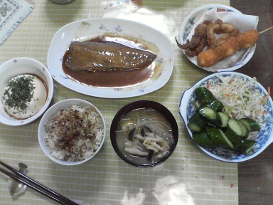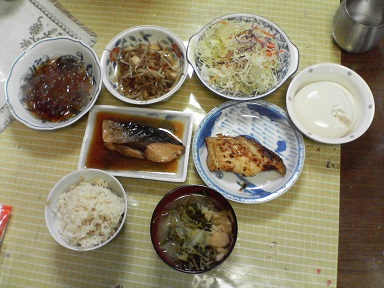 今日は魚がメイン?3種類の魚?鯖味噌など・・豆腐も頂きます。卵・・・味噌汁は茄子・・キャベツサラダは撮り忘れ・・今日もおいしく頂きました。