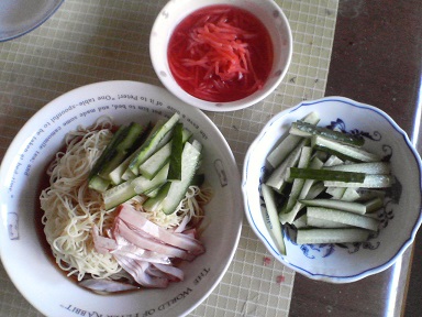 今日は冷し中華を頂きます。とりあえず、麺を少し固めに茹で、十分に水洗いします。タレをかけて胡瓜とハムをトッピングして完成。紅生姜はお好みで・・・今日もおいしく頂きました。