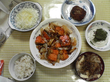 今日はシャケと野菜炒めを頂きます。シャケの切り身、玉葱、シメジなどを用意・・・フライパンにオリーブ油を入れ、角切りにしたシャケを炒めます。シャケに火が通ったら、一旦引き上げ、シメジ、玉葱などを炒めます。火が通ったら、シャケを入れます。市販の炒め物の素を入れて混ぜ合わせて完成。ハンバーグが余っていたので頂きます。豆腐も頂きます。味噌汁はダイコンとあぶらげ・・・キャベツサラダも頂きます。今日もおいしく頂きました。