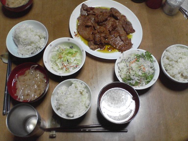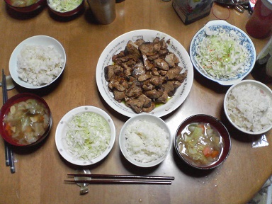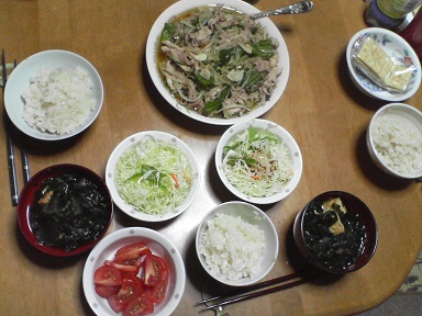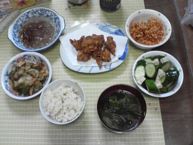 今日は唐揚を頂きます。鶏の唐揚・・・野菜炒めも頂きます。にんにく味噌・・・トコロテン・・・豆苗とワカメのスープも頂きます。胡瓜のサラダ・・・今日もおいしく頂きました。