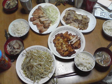 今日は豚肉を頂きます。フライパンにオリーブ油を入れ豚肉を焼きます。これはソテー風・・次は付けて焼くだけのカツの粉を使います。最後は薄肉・・・普通の焼き肉・・・フライパンを掃除し、モヤシを炒めます。オイスターソース、中華ダシなどで味付けして完成。豚肉も完成。味噌汁はシメジと茄子と油麩・・・今日もおいしく頂きました。