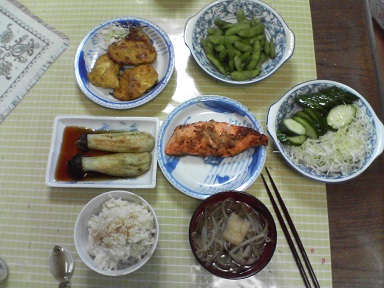 今日はシャケなどを頂きます。塩シャケのオリーブ油焼き・・・鶏も頂きます。茄子・・・枝豆のおつまみ・・・味噌汁はモヤシ・・・サラダも頂きます。今日もおいしく頂きました。