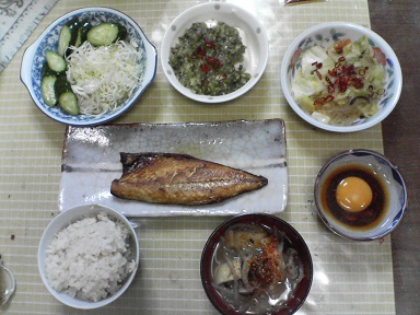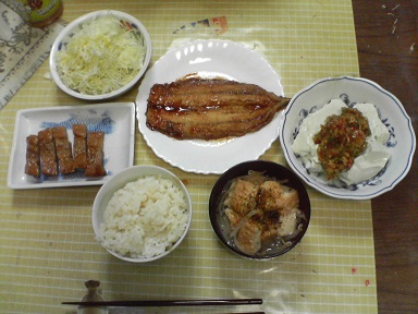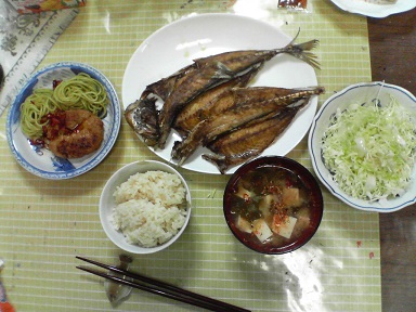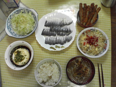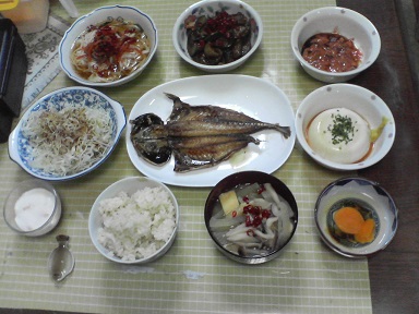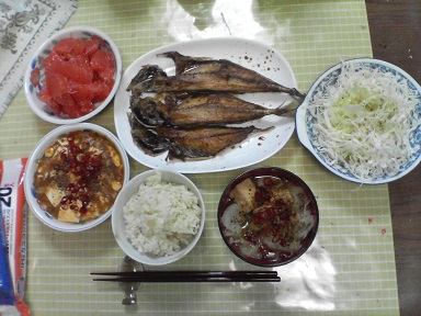 今日は鯵などを頂きます。フライパンにオリーブ油を入れ、鯵の開きを焼きます。適当に反しながら火を通します。完成。そうめんが余っていたので頂きます。茄子炒めも頂きます。豆腐・・・玉子も・・・塩辛も頂きます。味噌汁は大根とシメジ・・・キャベツサラダも頂きます。今日もおいしく頂きました。