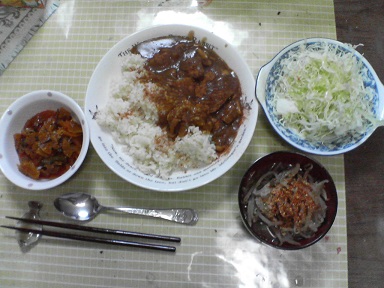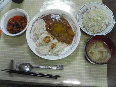 今日はカレーを頂きます。ポークカレーをカレー粉で強化?味噌汁はキャベツとあぶらげ・・・キャベツサラダも頂きます。今日もおいしく頂きました。