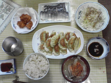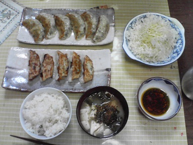 今日は餃子などを頂きます。フライパンにオリーブ油を入れ餃子を焼きます。水無し餃子?火が通ったら完成。コハダも頂きます。鶏のから揚げ。なぜか3個? 我が家では3個残った物が結構出てきます。味噌汁は大根とシメジ・・・キャベツサラダも頂きます。今日もおいしく頂きました。