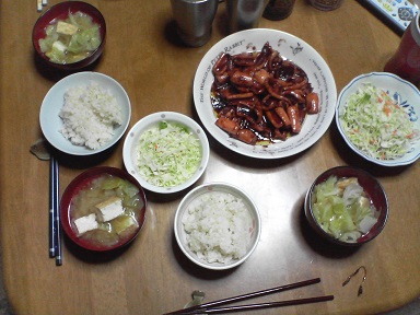 今日はイカ焼きを頂きます。フライパンにオリーブ油を入れ、切ったイカを入れて炒めます。味醂、ダシ醤油などで味付けします。水気が飛んだら、仕上げにバターを入れて完成。味噌汁はキャベツと揚げ豆腐・・・キャベツサラダも頂きます。今日もおいしく頂きました。