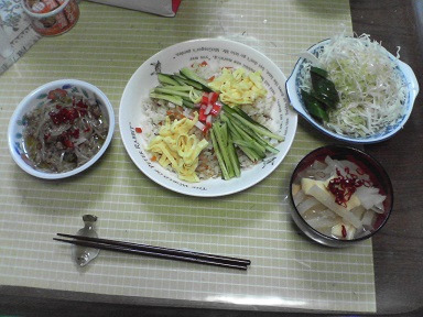 今日は五目寿司を頂きます。五目ないのに五目寿司?モヤシ炒めも頂きます。味噌汁は大根とあぶらげ・・・サラダも頂きます。今日もおいしく頂きました。