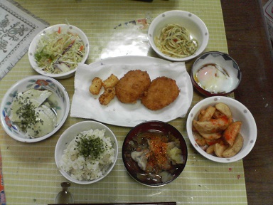 今日は揚物を頂きます。コロッケ・・・フライドポテト・・・今日はチーズがなかったので、そのまま頂きます。パスタが余っていたので頂きます。豆腐と温泉玉子も頂きます。味噌汁はキャベツと舞茸・・・キャベツサラダも頂きます。今日もおいしく頂きました。