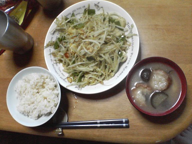 今日は野菜炒めを頂きます。モヤシ、ピーマン、エリンギを用意、適当にカットします。フライパンにオリーブ油を入れエリンギとピーマンから炒めます。スライスにんにくも加えます。エリンギに火が通ったら、モヤシを入れます。中華ダシ、塩コショーなどで味付けして完成。味噌汁は茄子と油麩・・・前回の流用?今日もおいしく頂きました。