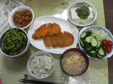 今日はカツなどを頂きます。チキンカツとトンカツ・・・豆腐も頂きます。なぜかラッキョウも?味噌汁はダイコンとあぶらげ・・・サラダも頂きます。おつまみ用の枝豆・・・今日もおいしく頂きました。