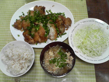 今日は鶏などを頂きます。鶏の竜田揚げ風?味噌汁はモヤシと卵・・キャベツサラダも頂きます。今日もおいしく頂きました。