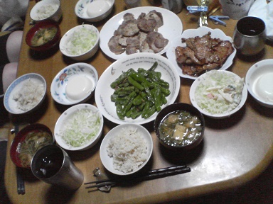 今日は豚肉などを頂きます。焼いた豚肉・・シシトウも頂きます。ガーリックと塩コショーで味付け、豆腐も・・味噌汁は豆苗とあぶらげ・・キャベツサラダも頂きます。今日もおいしく頂きました。