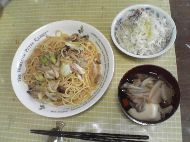 今日はパスタなどを頂きます。ツナとキャベツとシメジと一緒に炒めたパスタ・・豚汁?キャベツサラダも頂きます。今日もおいしく頂きました。