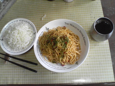 今日はパスタなどを頂きます。ペペロンチーノ風?キャベツサラダも頂きます。今日もおいしく頂きました。