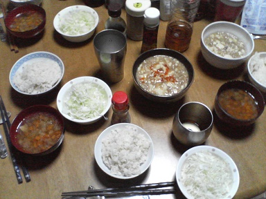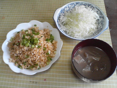 今日は炒飯などを頂きます。普通の炒飯?味噌汁は舞茸とあぶらげ・・キャベツサラダも頂きます。今日もおいしく頂きました。