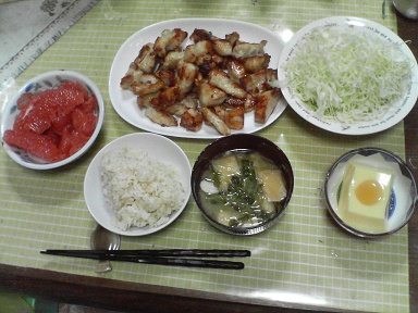 今日は鶏肉などを頂きます。鶏の塩焼き・・玉子豆腐も頂きます。味噌汁は豆苗とあぶらげ・・キャベツサラダも頂きます。グレープフルーツも・・今日もおいしく頂きました。