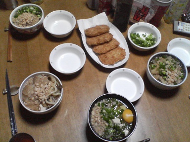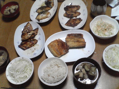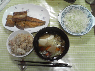今日はホッケなどを頂きます。オリーブ油で焼いたホッケの開き・・玉子豆腐らしきものが余っていたので頂きます。味噌汁はシメジとあぶらげ・・キャベツサラダも頂きます。今日もおいしく頂きました。