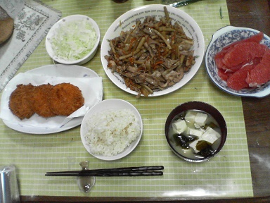 今日は豚肉などを頂きます。フライパンにオリーブ油を入れ、豚肉とゴボウ、ニンジンなどを炒めます。焼き肉のタレで味付けして完成。コロッケも頂きます。味噌汁は豆腐とワカメ・・キャベツサラダも頂きます。グレープフルーツも・・今日もおいしく頂きました。