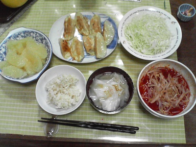 今日は餃子などを頂きます。普通の餃子?茹でたモヤシにピリ辛ソース・・ワンタンスープも頂きます。キャベツサラダも頂きます。グレープフルーツも・・今日もおいしく頂きました。