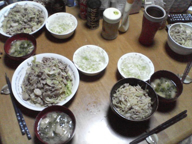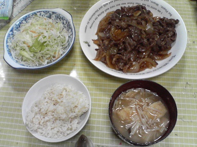 今日はジンギスカンなどを頂きます。フライパンにオリーブ油を入れ、味付けラム肉と玉葱を炒めます。完成。味噌汁はエノキとあぶらげ・・サラダも頂きます。今日もおいしく頂きました。
