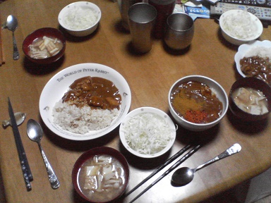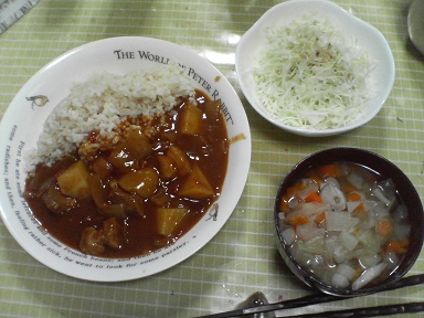 今日はカレーなどを頂きます。ポークカレー?味噌汁はシメジと揚げ豆腐・・キャベツサラダも頂きます。今日もおいしく頂きました。