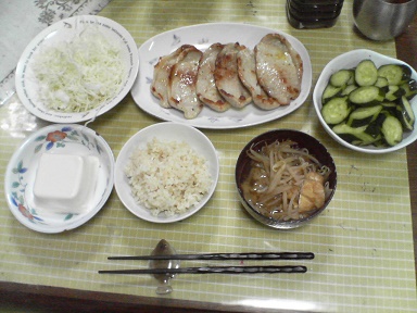 今日は豚肉などを頂きます。オリーブ油で焼いた豚肉、塩コショーで頂きます。豆腐も頂きます。胡瓜漬けも・・味噌汁はモヤシとあぶらげ、キャベツサラダも頂きます。今日もおいしく頂きました。