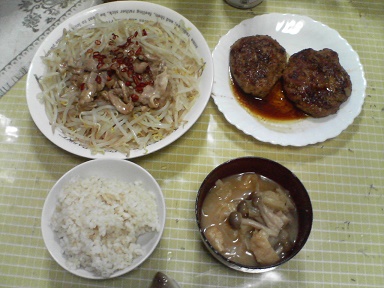 今日はハンバーグなどを頂きます。普通のハンバーグ、少々焦げ気味?モヤシも頂きます。味噌汁はシメジとあぶらげ・・今日もおいしく頂きました。