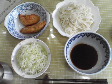 今日はうどんなどを頂きます。冷やしうどん、濃い目のタレで頂きます。おかずに鶏天も・・キャベツサラダも頂きます。今日もおいしく頂きました。