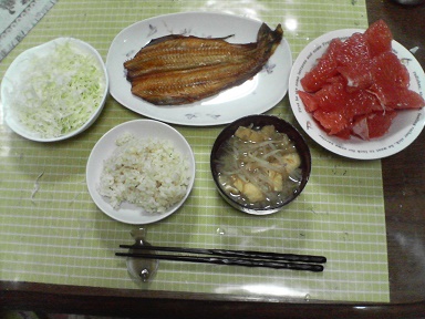 今日はホッケなどを頂きます。ホッケの開き・・味噌汁はモヤシとあぶらげ・・キャベツサラダも頂きます。グレープフルーツも・・今日もおいしく頂きました。