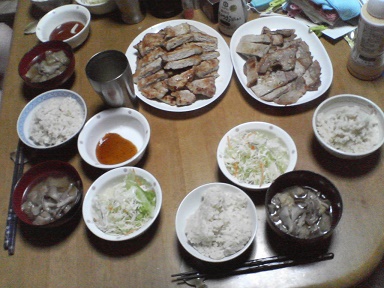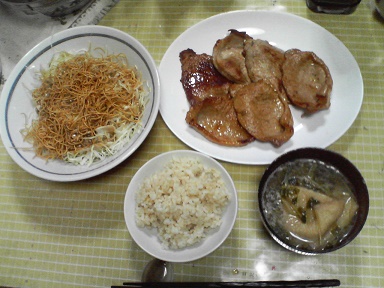 今日は豚肉などを頂きます。素焼きの豚肉、焼き肉のたれで頂きます。味噌汁は舞茸とあぶらげ・・キャベツサラダも頂きます。今日もおいしく頂きました。
