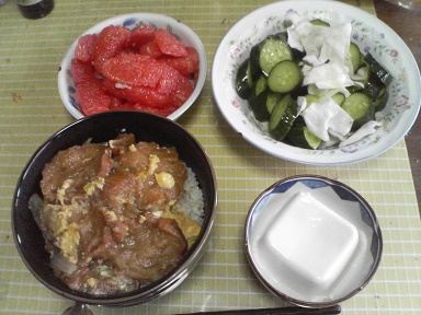 今日は油麩丼などを頂きます。油麩と玉葱をダシ醤油で煮込み、卵でとじたもの・・豆腐も頂きます。漬物、グレープフルーツも・・今日もおいしく頂きました。