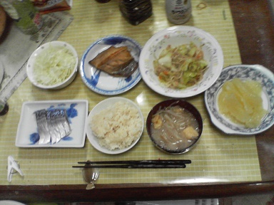 今日は鯖などを頂きます。鯖の切り身・・味噌汁は茄子とあぶらげ、キャベツサラダも頂きます。今日もおいしく頂きました。
