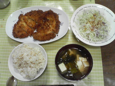 今日はカツなどを頂きます。とんかつ?味噌汁は豆腐とワカメ・・キャベツサラダも頂きます。今日もおいしく頂きました。