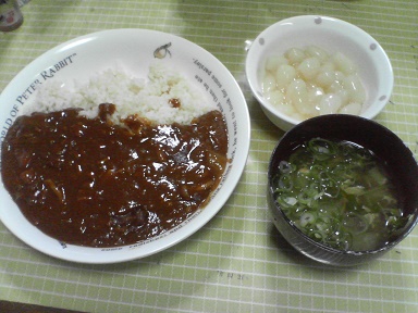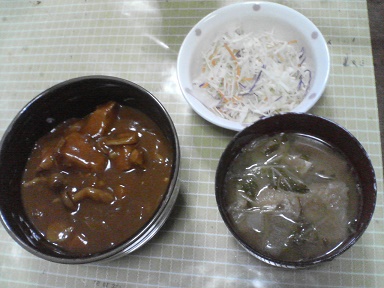 今日はカレーなどを頂きます。普通のカレー?丼で頂きます。味噌汁は豆苗とあぶらげ、キャベツサラダも頂きます。今日もおいしく頂きました。