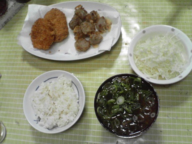 今日は揚物などを頂きます。コロッケと揚焼売、汁物は前回のエノキ汁流用、ネギ大盛・・キャベツサラダも頂きます。今日もおいしく頂きました。