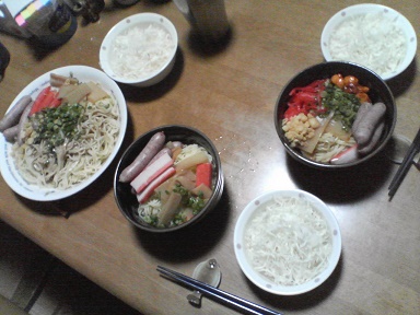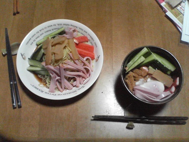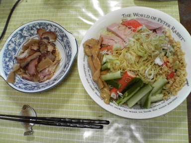 今日は冷やし中華などを頂きます。有り合わせの具材の冷やし中華、好みで丼で頂きます。今日もおいしく頂きました。